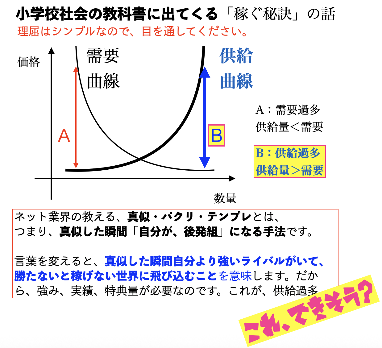 なぜなら、供給過多。真似した時点で、残念ながら「あなたが、ライバル界隈の中で一番弱い存在」なのです。だから、実績とか知名度とかがないと目を向けてもらえないのです。